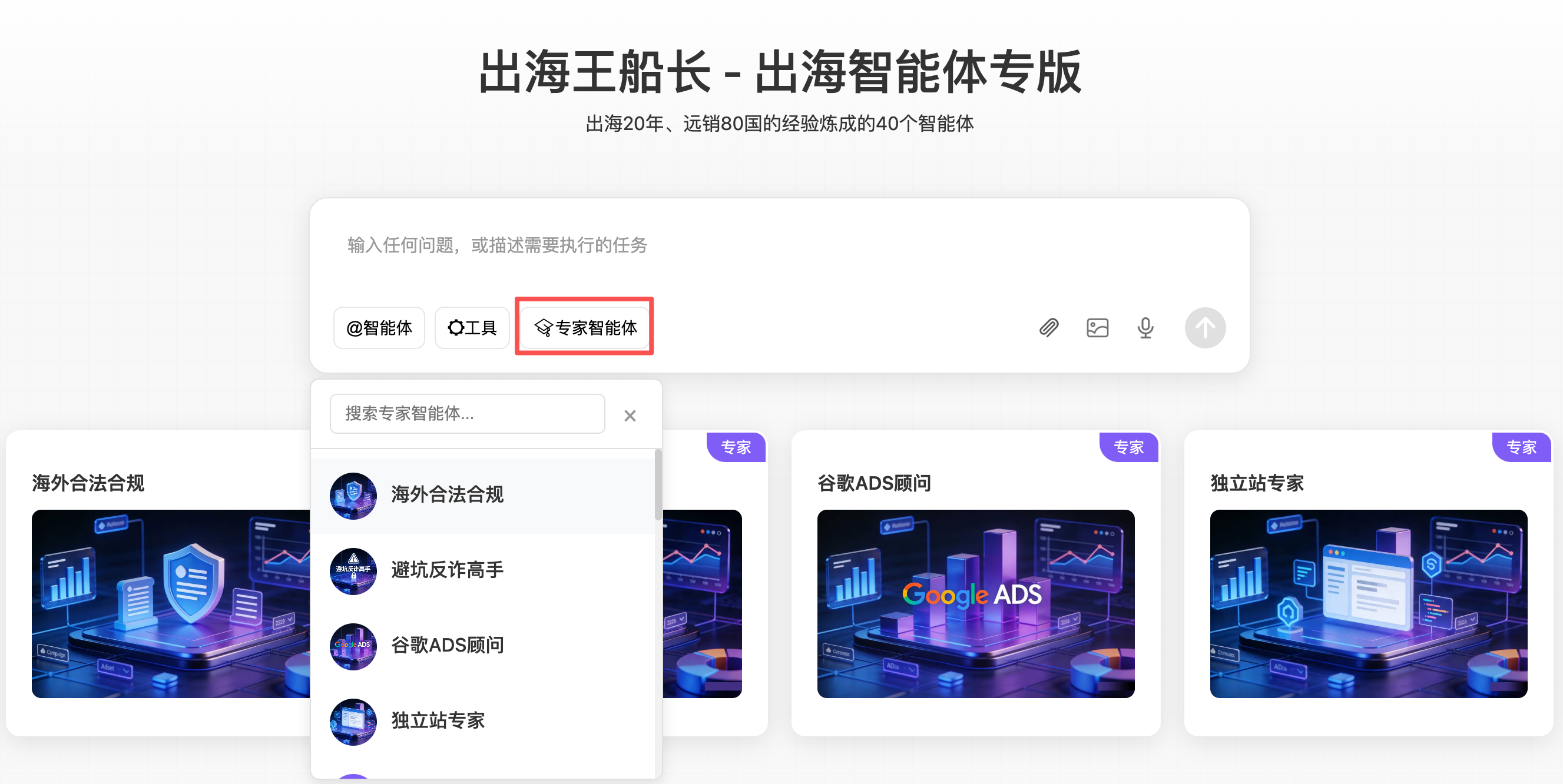 “出海王船长”是网帮团队创始人:王培兵先生打造的个人IP,“出海智能体专版”是结合团队出海20年、产品远销80国的经验而提炼出的专属智能体平台,目前已上线了超40个出海专属智能体,用AI赋能出海业务。